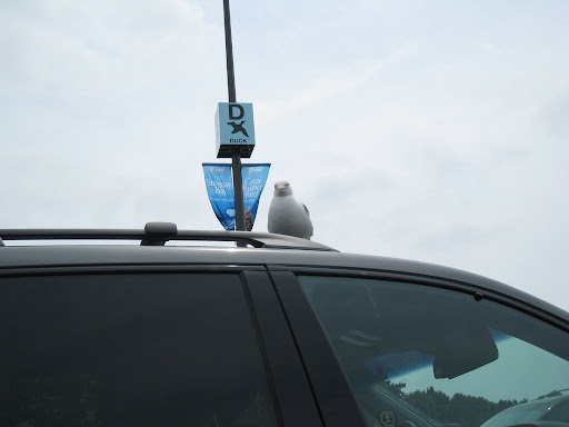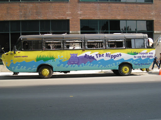 這是什麼東西?河馬專車?給小朋友坐的嗎?不是,這是海陸兩用車喔!它開到湖上之後會直接浮在水面上。朋友說,仔細看車體,那是船身喔!