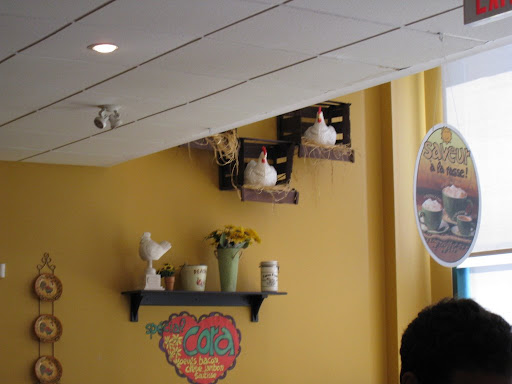Chez Cora的店用早餐,這裡面放了很多正在下蛋的母雞模型。